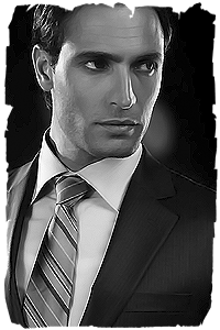 Одет в классический тёмный костюм, белая рубашка, галстук. Классические туфли.